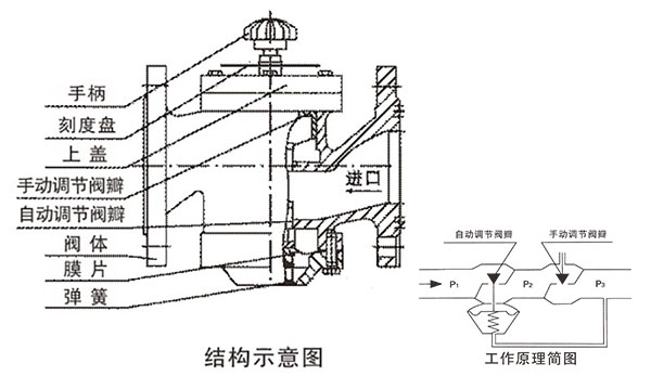 该阀主要由阀体,上下盖、自动调节阀瓣、手动调芾阀瓣,膜片和弹簧等组成,如图所示