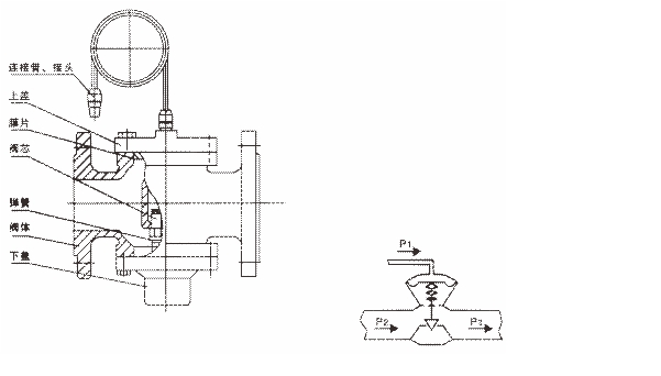 现以安装在回水管道上的ZYC型自力式压差控制阀为例说明工作原理。当供水压力P1增大或减不时,信号由连接管传入膜片上腔,带动阀芯下移或上移,使阀座的流通面积减小或增大。P2 - P3也增大或减小,直到P1-P2保持原值恒定。当回水压力P3增大或减小的:瞬间同阀座流向出口的流速降低或升高,膜片下压力P2也在这个瞬间增高或降低,带动阀芯上移或下移,直到膜片的受力重新平衡,P2恢复原值,P1-P2保护原值恒定,从而保证了被控系统的供回水间压差基本不变