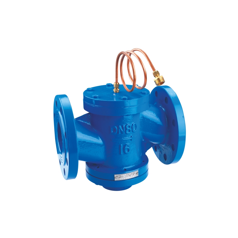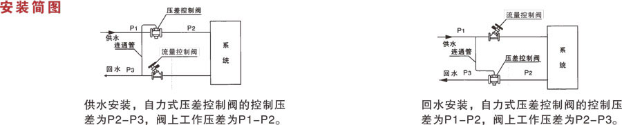 按阀体上箭头所示的水流方向安装,DN32- 125的要安装在回水管道上,在供水管道上将连通管的安装接头装好,并确认其内孔与供水管相通(安装接头为1/4管螺纹),然后装上连通管,连通管的另一头与阀门上的控制孔相连,DN15- -25的要装在供水管道上,连通管与回水相通。如下图所示。